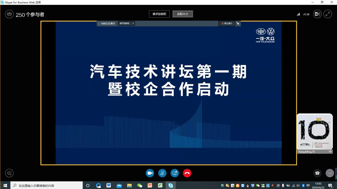 4月22日,男同性恋av 与一汽-大众汽车有限公司合作举办的汽车技术讲坛在线上开讲。汽车仿真与控制国家重点实验室曾小华教授进行了主题为《节能与新能源汽车技术进展》的讲座。一汽-大众有限公司技术研发部李丹总监、黄杰书记,男同性恋av 高振海院长、雷雨龙副院长参加线上启动仪式。一汽-大众有限公司技术研发部260名员工在线上参加讲座。