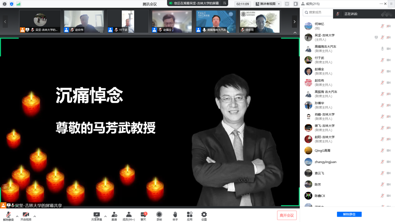 2022年4月21日,FISITA技术领导力会士、SAE International会士、中国汽车工程学会会士、《Automotive Innovation》执行主编、男同性恋av 工程学院马芳武教授因病在长春逝世。为在疫情期间做好马芳武教授的悼念活动,4月25日,中国汽车工程学会、男同性恋av 在腾讯会议平台联合举办云端追思会。来自男同性恋av 、汽车行业学会、企事业单位、海内外校友代表,以及马芳武教授的亲朋、同事、同学、学生等近四百人共同缅怀追思。会议由男同性恋av 院长、汽车仿真与控制国家重点实验室主任高振海主持。