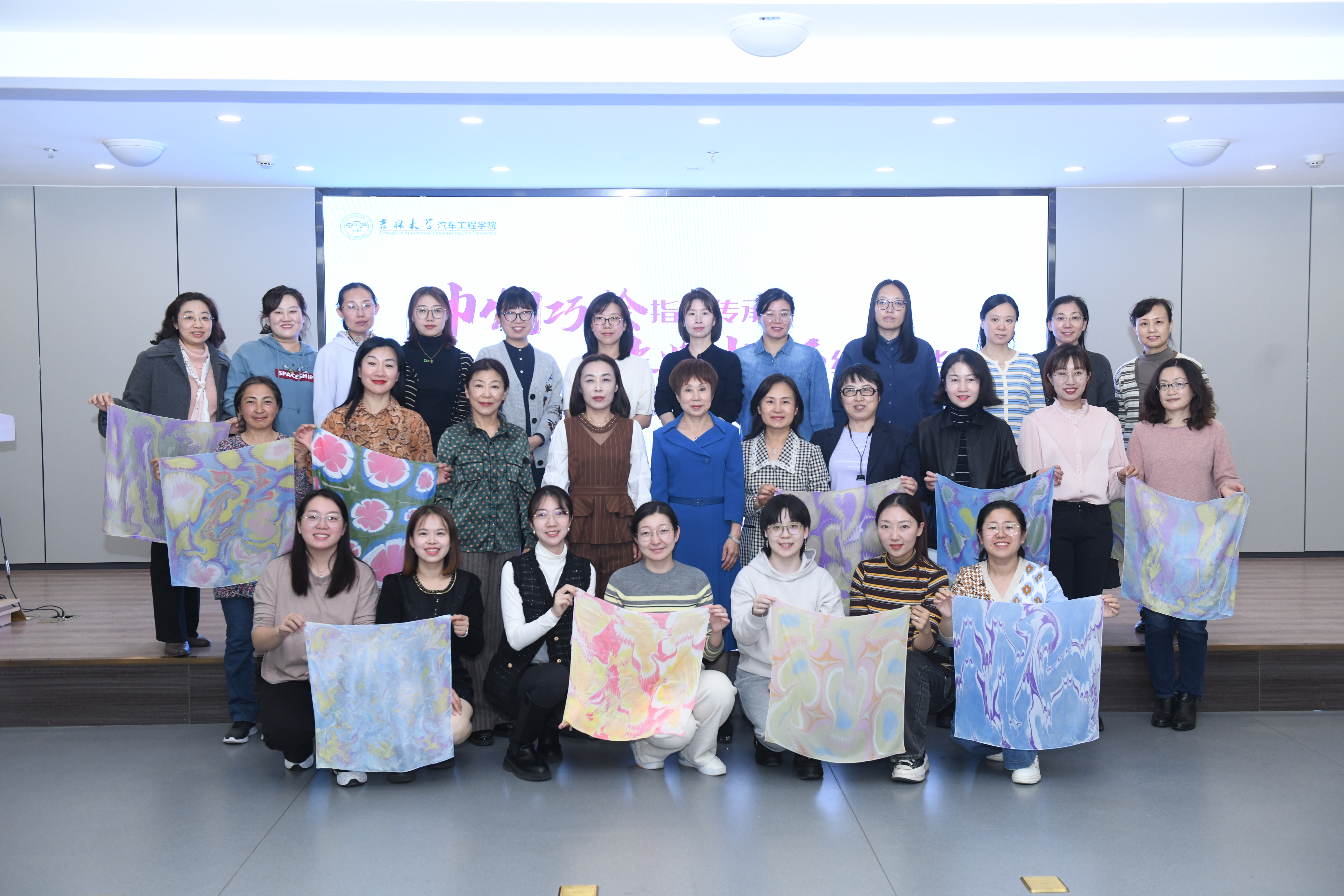 本次活动以歌颂党、礼赞中国文化,展现汽院女性风采为主题,通过多彩的水拓丝巾创作,体会色彩和国潮的别样魅力,促进思想与艺术的有机融合。引导女教工们以独特的多元视角、灵动的内心意识,在继承优良文化传统的同时彰显时代特征,展现巾帼芳华,汇聚奋进力量。