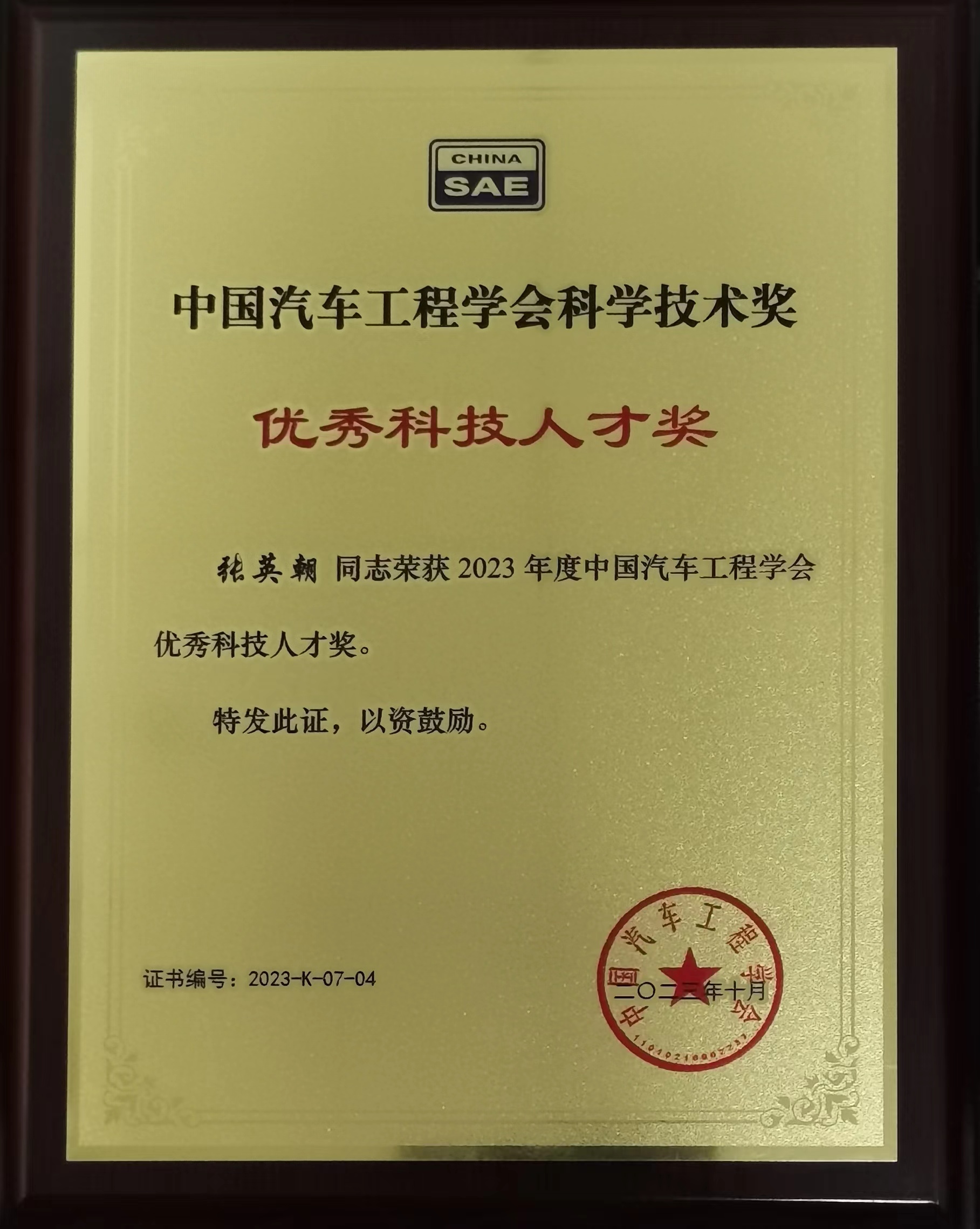10月25日,2023年度中国汽车工程学会年会及展览会(SAECCE 2023)在北京召开。根据《中国汽车工程学会科学技术奖励办法》规定,经中国汽车工程学会科学技术奖评审委员会评审,中国汽车工程学会科技奖励工作委员会八届四次会议审议通过,授予男同性恋av 张英朝教授“2023年度中国汽车工程学会优秀科技人才奖”。在本次年会上,学会为张英朝教授颁发了获奖证书和奖牌。