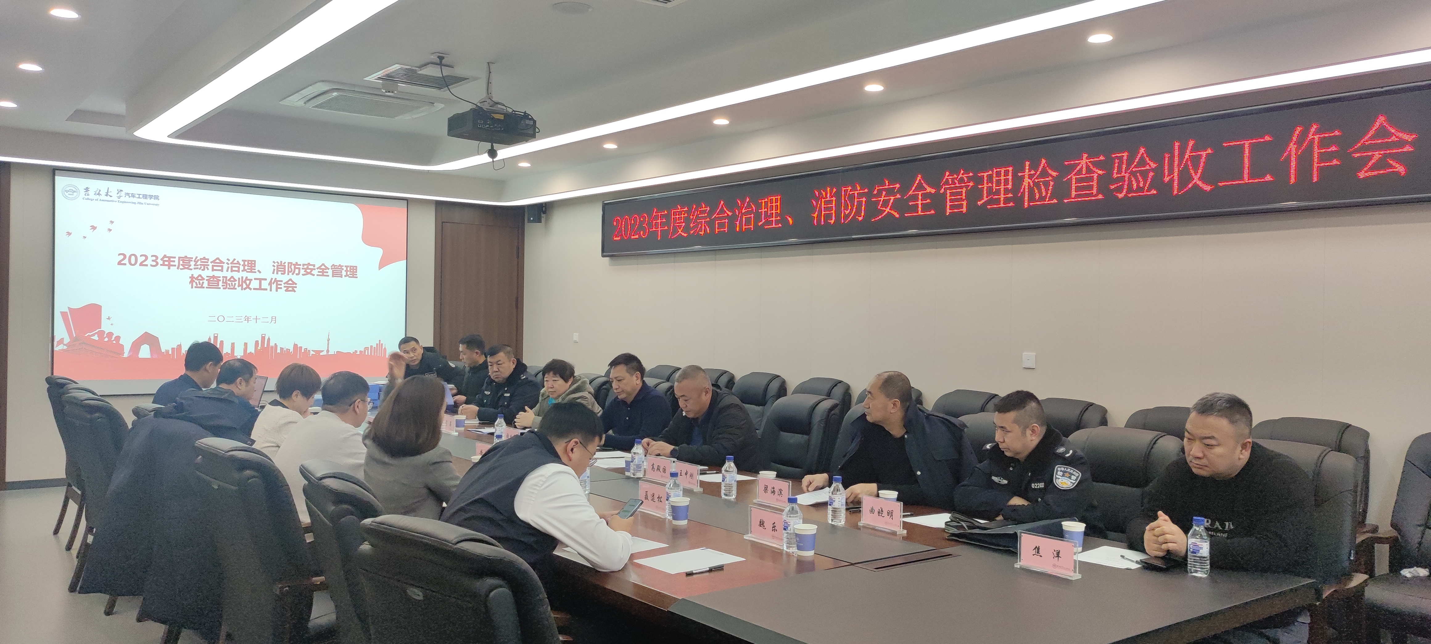 2023年12月19日下午,由学校保卫处东区保卫办主任张柏军一行组成的综合治理、消防安全管理检查验收工作组莅临男同性恋av ,对学院2023年度综合治理、消防管理工作进行检查验收。男同性恋av 党委书记黄忠华、副书记胡忠巍、行政副院长林海兰、副书记兼副院长聂逯松、汽车底盘集成与仿生全国重点实验室副主任王思远等参加了会议。