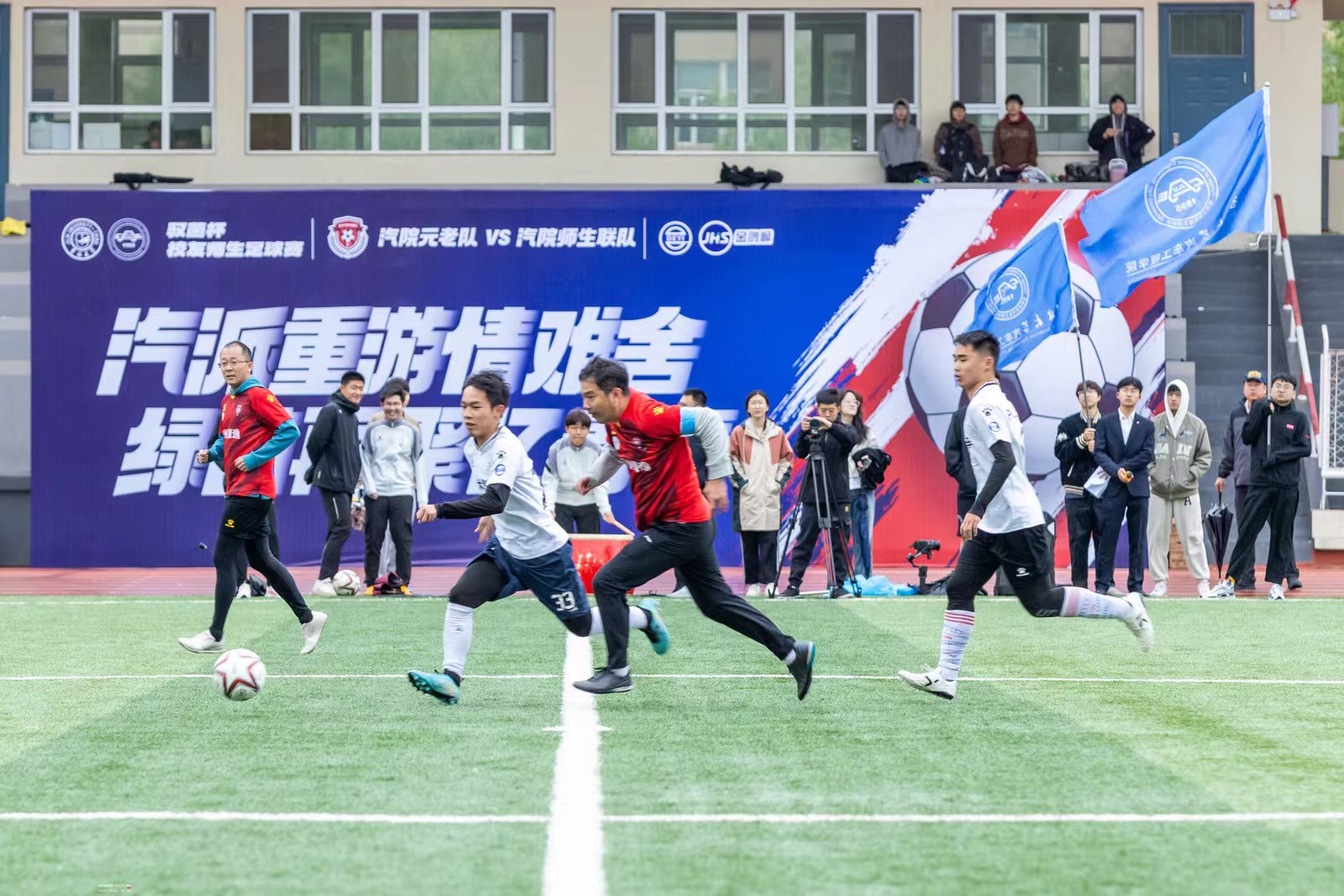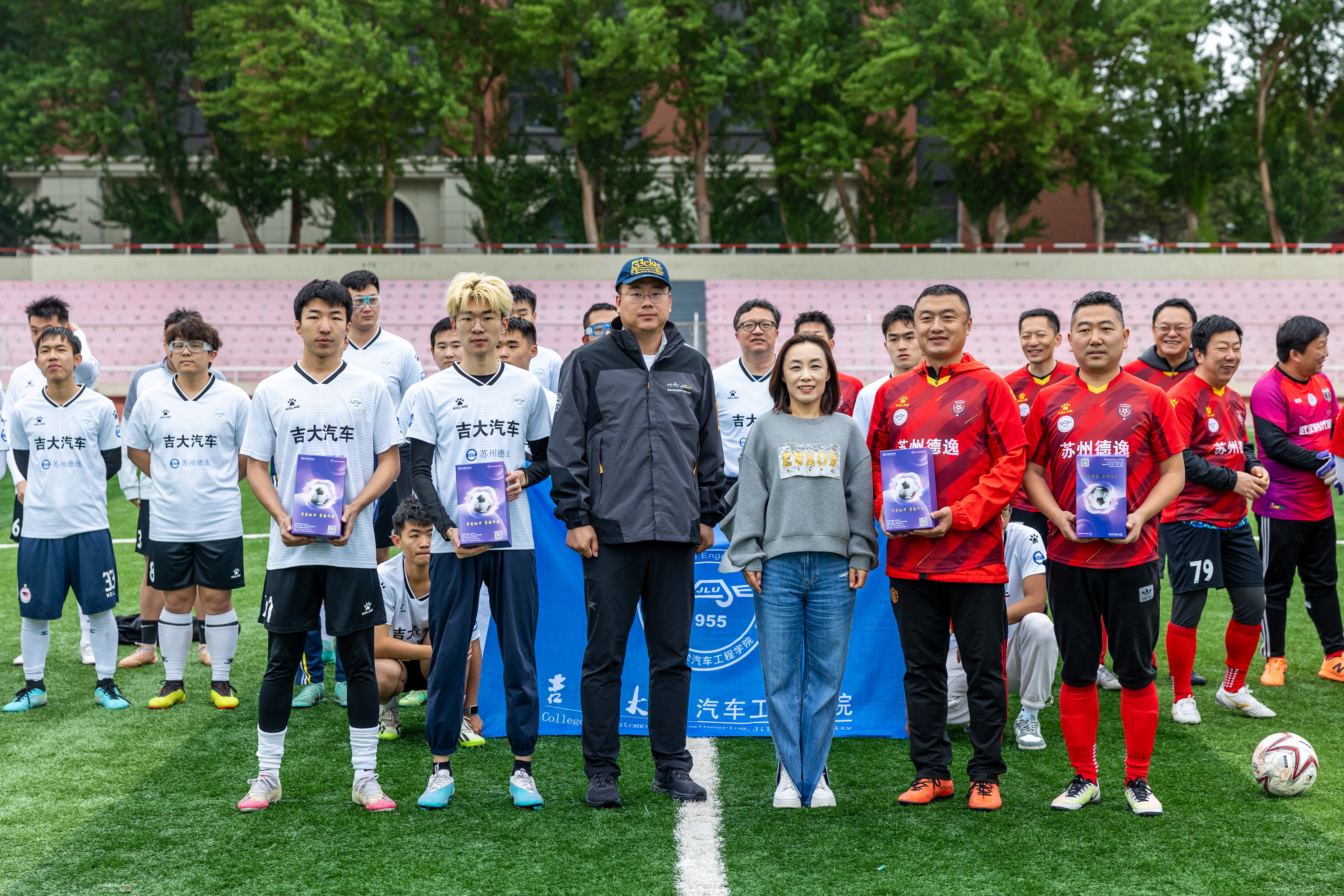苏州德逸新能源汽车科技有限公司董事长、苏州金鸿顺汽车部件股份有限公司首席科学家林逸将凝结了汽院精神的“驭茵杯”奖杯授予双方球队队长,1996级校友、校友足球队队长杨佳音和师生足球队队长崔文骞共同接过奖杯,并合影留念。