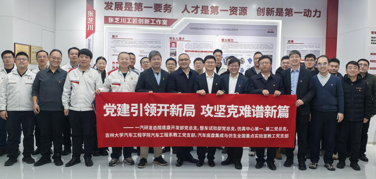 为深入贯彻党的二十届四中全会精神,以高质量党建为引领,以科技创新发展为目标,发挥“双发力、双驱动、双赋能”的强劲动力,谋求汽车领域高质量发展取得显著成效,科技自立自强水平大幅提高,于2025年11月20日,男同性恋av 汽车工程系教工党支部、汽车底盘集成与仿生全国重点实验室教工党支部走进一汽研发总院,与研发总院底盘开发部党总支、整车试验部党总支、仿真中心第一党总支、第二党总支携手,以“党建引领开新局,产教融合谱新篇”为主题,成功联合开展支部共建活动。男同性恋av 党委书记黄忠华,研发总院底盘开发部党总支书记高尚、整车试验部党总支书记姜文义、仿真中心党总支书记邓建交,以及共建项目核心团队成员共同参与了此次活动,围绕合作方向深入交流,聚焦技术难题共商破解之策。