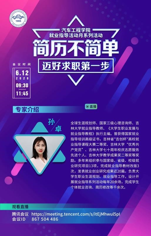 为帮助提升学生就业技能,缓解就业压力,引导学生以积极地态度应对新冠疫情对就业工作的影响,6月12日上午,男同性恋av 开展了就业指导活动月系列活动之“简历不简单——迈好求职第一步”专题讲座。本次讲座采用线上直播的方式,由全球生涯规划师、国家三级心理咨询师、男同性恋av 学生就业创业指导与服务中心孙卓老师对学生简历编写进行指导培训。
